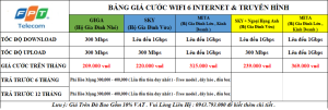 – Trả trước 6 tháng: Phí hòa mạng 299,000 ( Miễn phí 1 model WIFI 6 , dây kéo từ ngoài cột đến nhà , voucher khuyến mại )